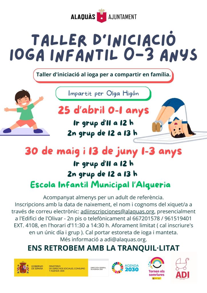 En l’ ADI hem organitzat els dies 25 d’abril, 30 de maig i 13 de juny, al costat de la professional Olga Higón, un taller de ioga dirigit a xiquets i xiquetes de 0 a 3 anys, un espai pensat per a compartir en família, gaudir i afavorir el benestar des dels primers anys de vida.